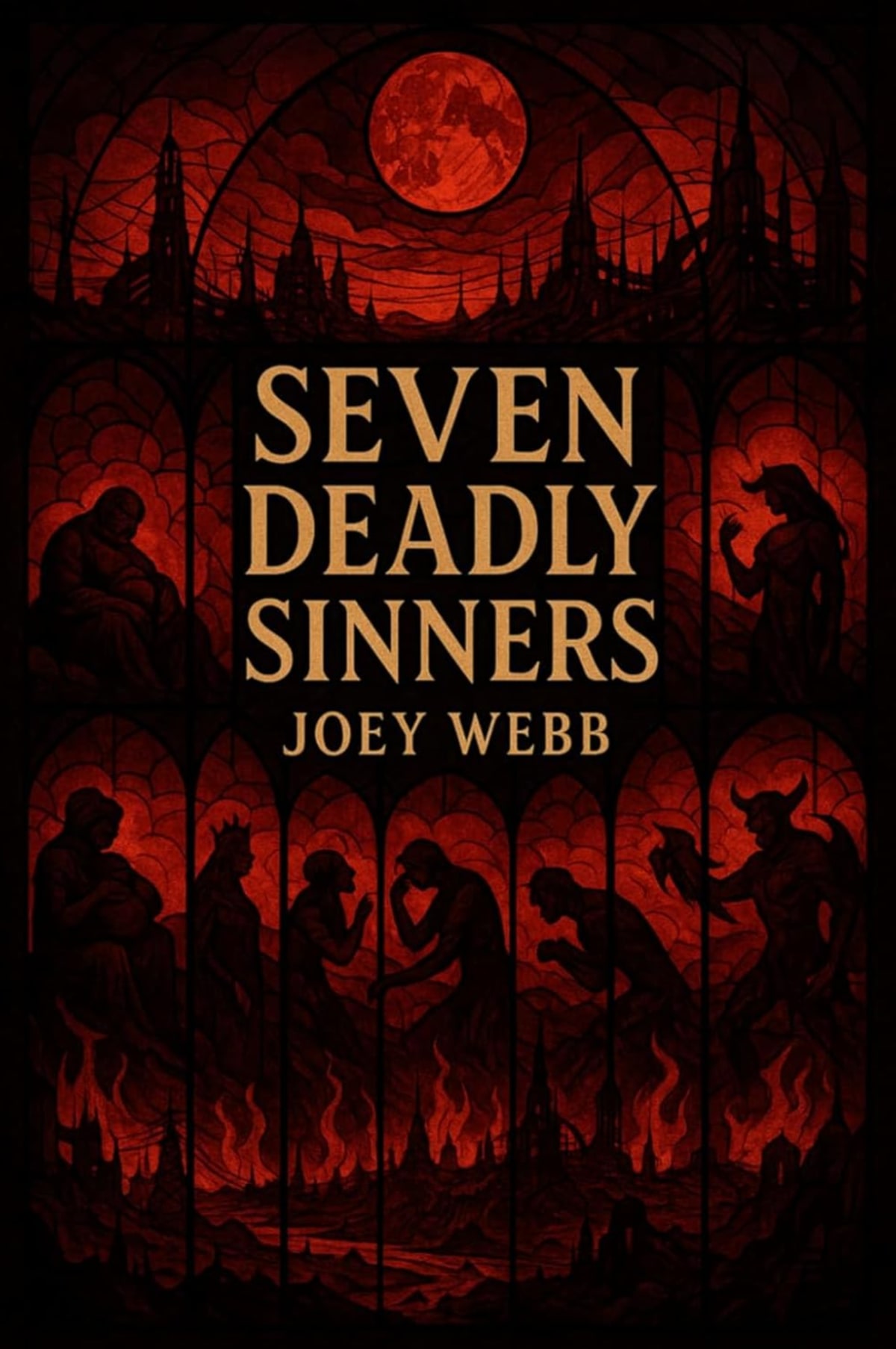 Seven Deadly Sinners by Joey Webb has a brand-new cover—dripping with red, black, and stained-glass menace.